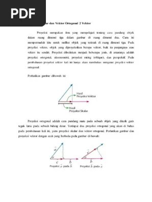 Misalkan vektor oa = a, ob = b dan oc = c, maka c adalah proyeksi vector a pada b. Proyeksi ortogonal vektor a pada vektor b adalah 'bayangan tegak lurus'. Dengan skalar k dapat kita rumukan dengan memakai rumus seperti . Menurut rumus sudut antara dua vector a dan b diperoleh : Ada dua macam proyeksi vektor ortogonal , yaitu :